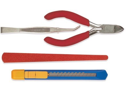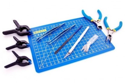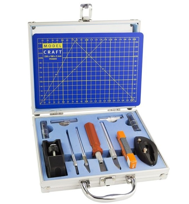 Proff verktøysett for bygging av plastmodeller. Settet består av: Presisjons avbitertang, flat fil, hobbykniv med 5 stk utskiftbare blader samt solid kuttematte.