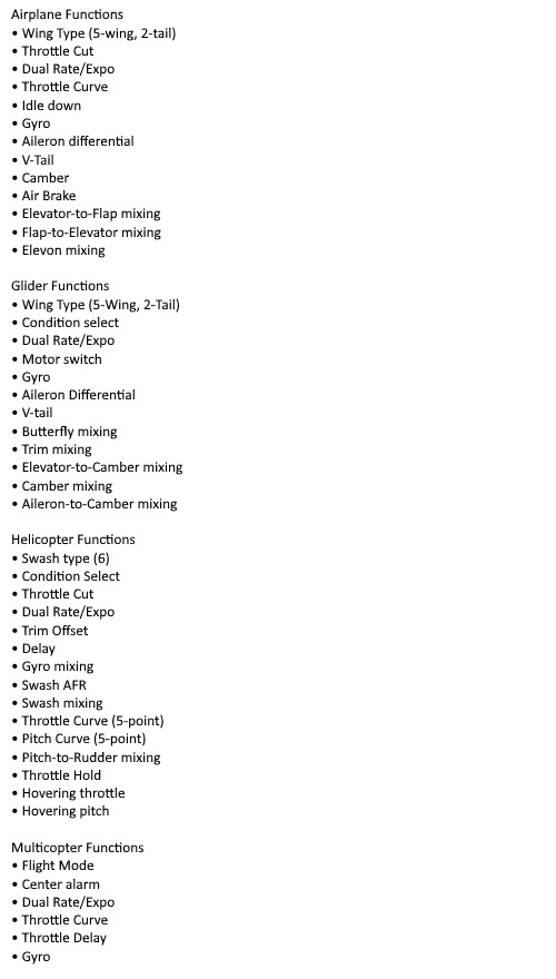 Telemetri, glider-mix, multicopter funksjoner, trottle cut, failsafe, etc.