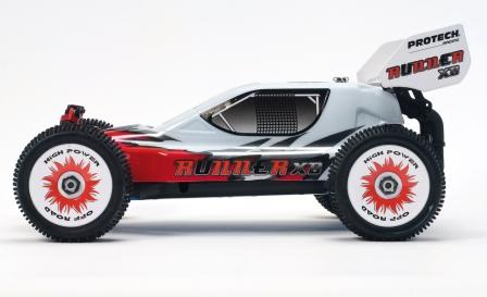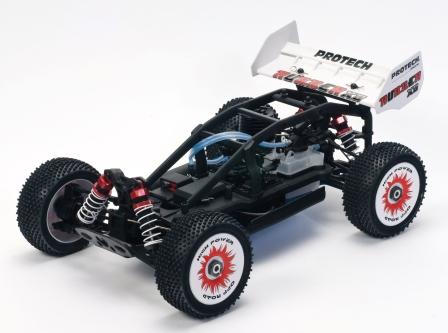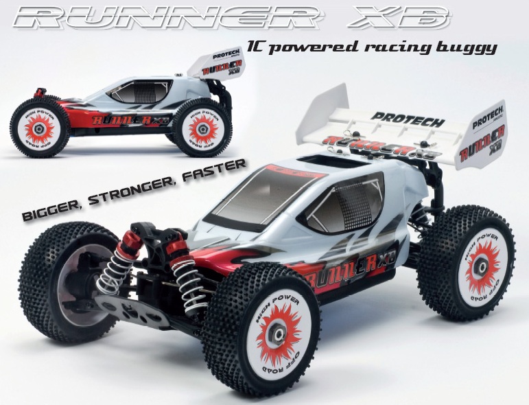 Protech Runner XB 1/10 Buggy 4WD RTR er en kraftig og sterk bil med ekstra veltebøyler for røff bruk. Komplett ferdigbygd med 4WD og sterk .18 motor med snorstart og tunepipe eksosanlegg.