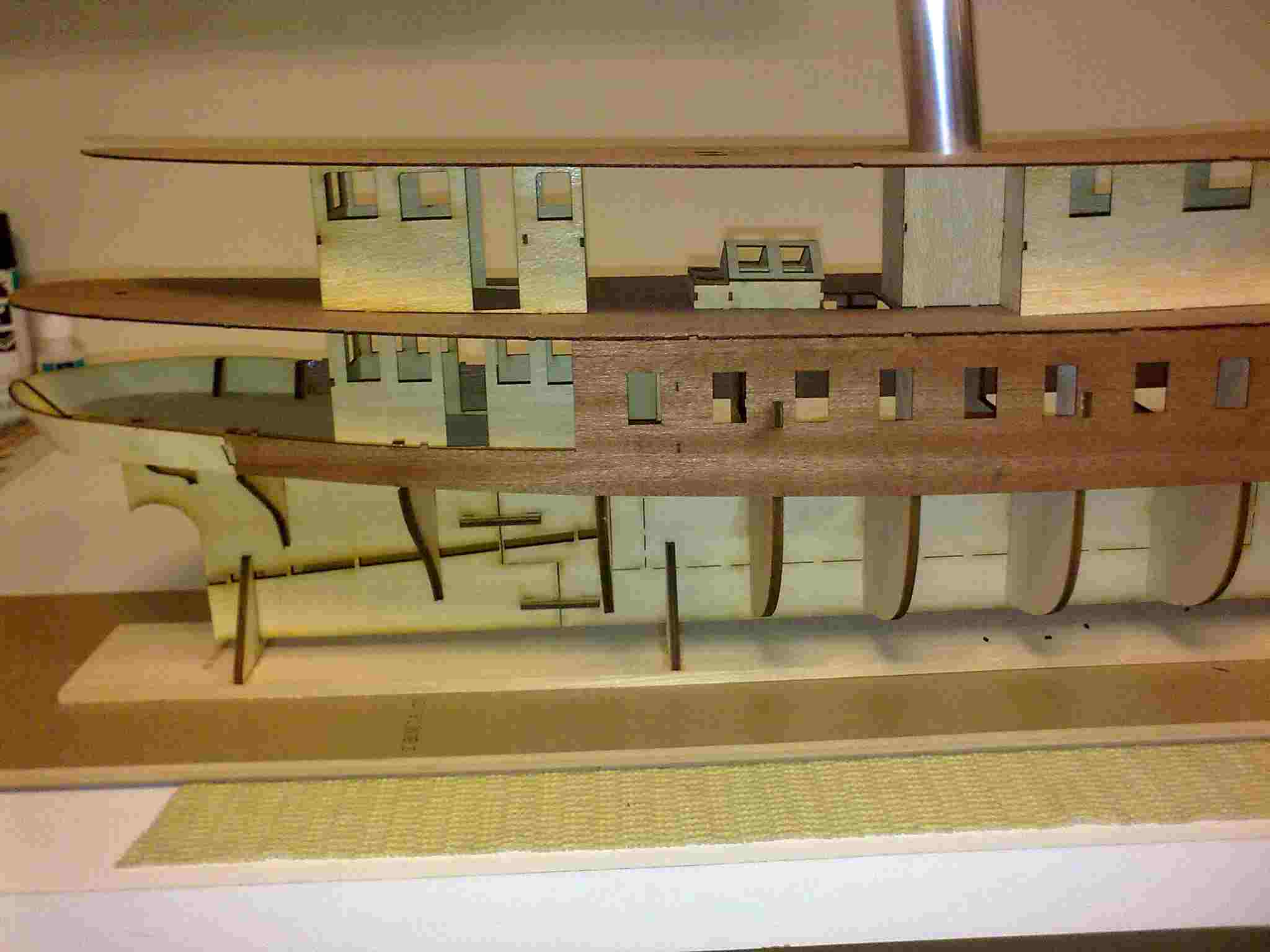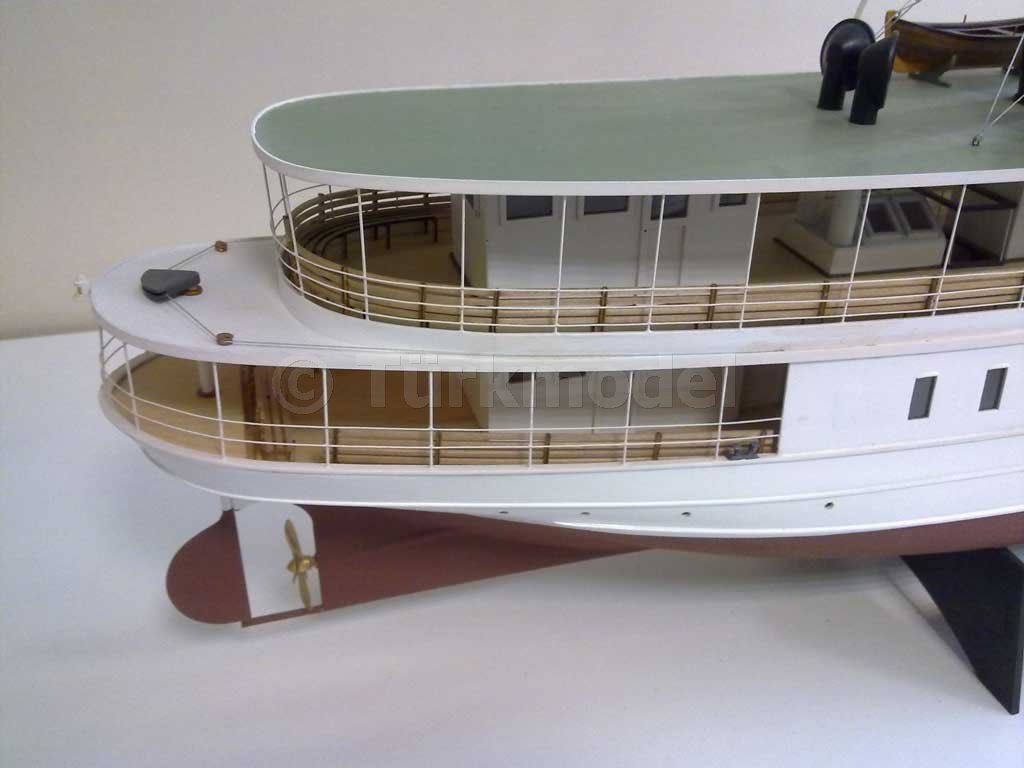 Trebyggesettet består av: Laserkuttet finer til alle spanter, skott, dekk, dekksider, livbåter, esinger + diverse med alle hull ferdig kuttet ut, alle kledningsbord til skrog, dekksplank, vinduer ferdig utskjært, alle dekksbeslag 3D-printet som daviter, skorstein, propell, pullere, koøyer, ventiler, ratt, tauverk + mye mer, dekaler, flagg, flotte tegninger og byggebeskrivelse.