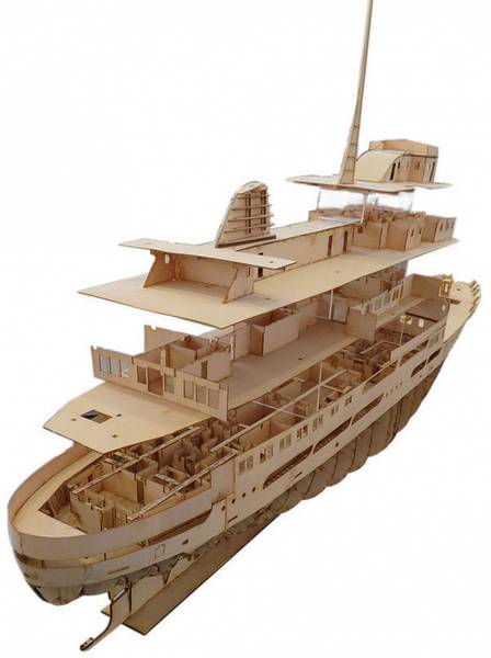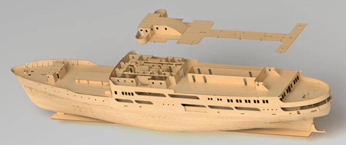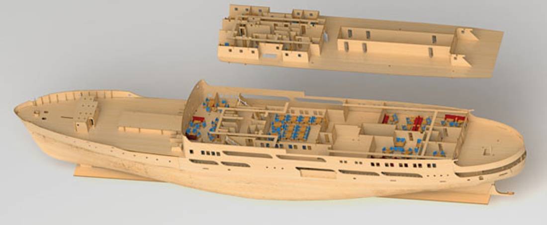 Modellen har full innredning på alle dekk. Dekkene kan løftes fra hverandre for å se båten innvendig og gi tilgang til motorrommet.