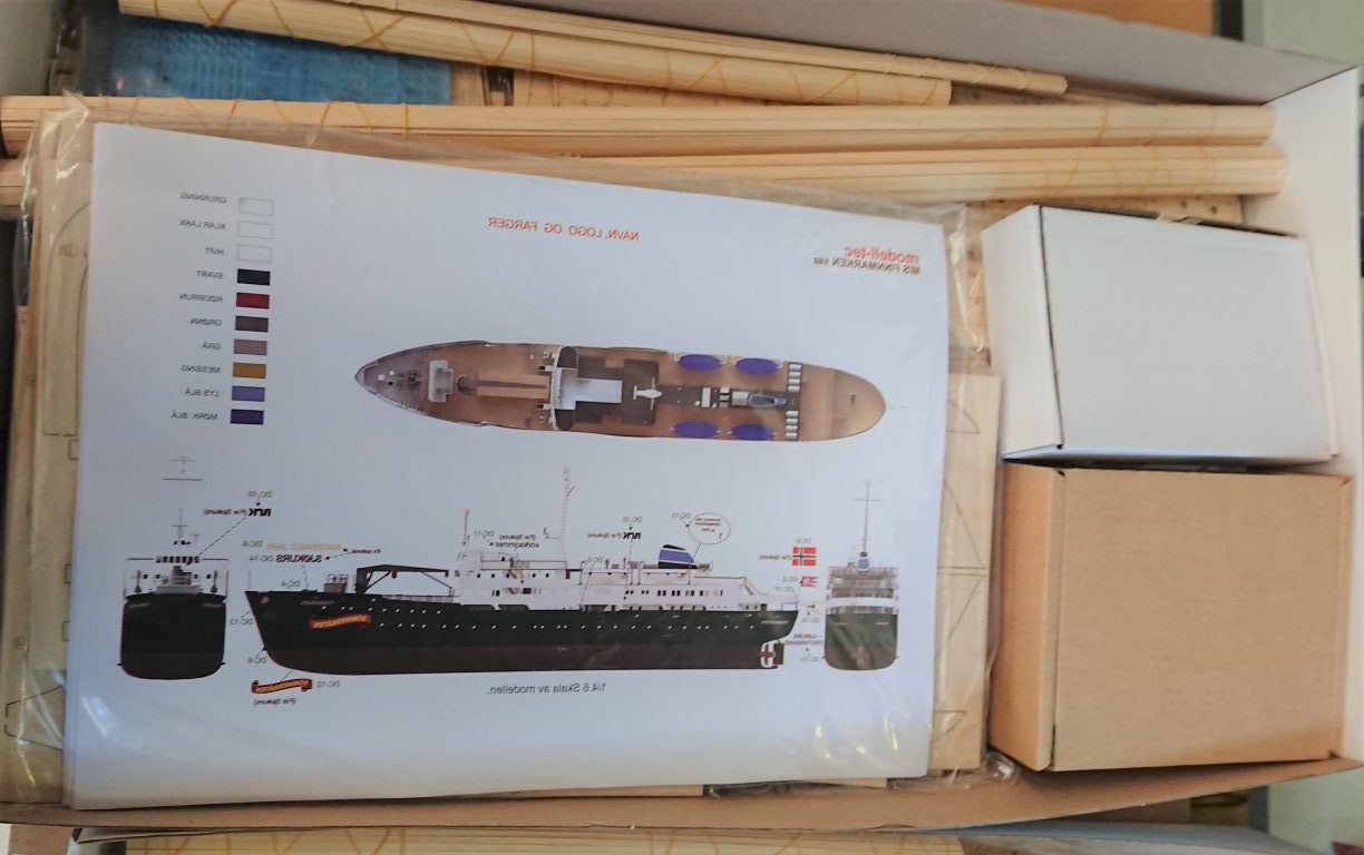 Trebyggesettet består av: Laserkuttet finer til spanter, skott, overbygg, dekk og innredningsdetaljer, alle kledningsbord til skrog og dekk, vinduer og vindusrammer. Dekksbeslag, rekker, propell, redningsbøyer, dekksutstyr, livbåter med innredning + mye annet ferdig 3D-printet. Omfattende sett av plaststøpte detaljer. Belysningssett med over 100 LEDlys, kabler og utstyr. Master, dekaler til M/S Finnmarken, M/S Ragvald Jarl, M/S Sjøkurs og NRK Sommerbåt, oppstillingskrybbe, tegninger og byggebeskrivelse + mye mer.