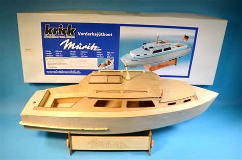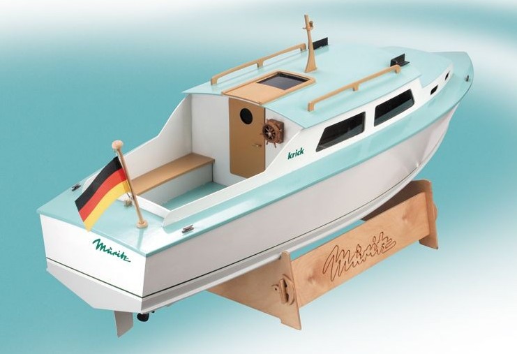 Flott laserskåret byggesett med alle trematerialer som spant, kjøl, stevn, kledning og bunnplater, speile, lister, dekk, dekksdetaljer, messinglanterner, ratt, pullere, propell, aksel, hylse, oppstillingskrybbe og byggebeskrivelse.