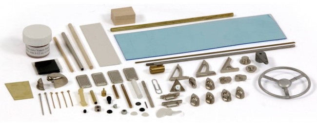 Byggesettet innholder alle trematerialer som spant, PVC-plater og kledningsbord til skrog og dekk, innredningsdetaljer etc.