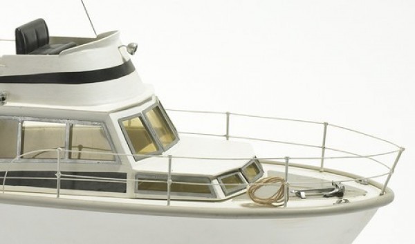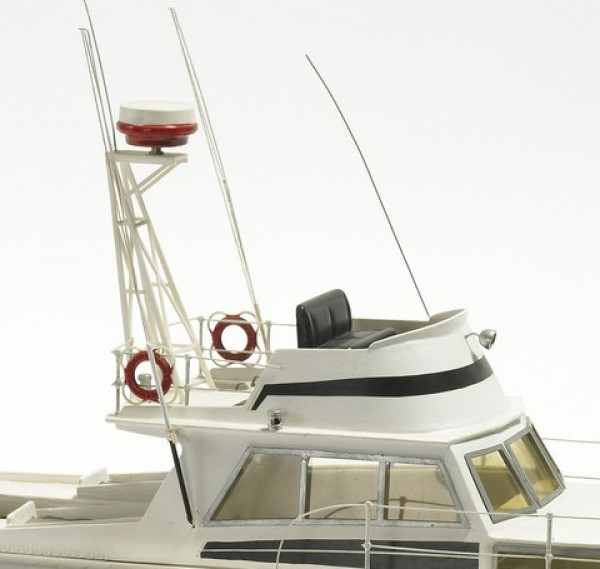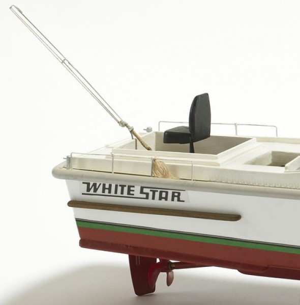 Modell av karakteristisk amerikansk sportfiskebåt. Flott laserskåret trebyggesett med plastskrog, aksel, propell og oppstillingskrybbe. Fin nybegynnermodell.