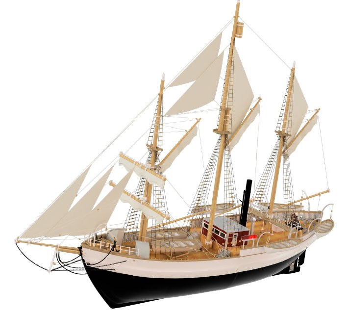 Trebyggesettet består av: Laserkuttet finer til spanter, skott, overbygg, dekk og innredningsdetaljer, alle kledningsbord til skrog og dekk, dekksbeslag, rekker, leidere, vinsjer, ratt, daviter, ventiler, dekksutstyr + mye annet ferdig 3D-printet, skorstein, livbåter med innredning, belysningssett med LED-lys, master, komplett seil, oppstillingskrybbe, tegninger og byggebeskrivelse + mye mer.