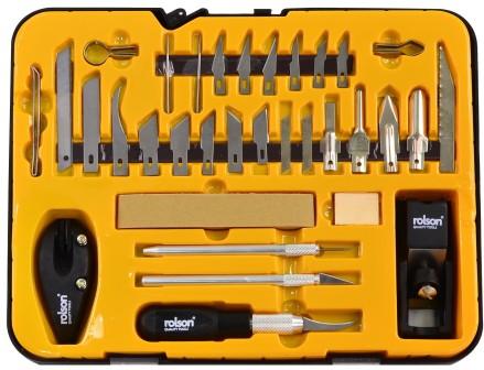 3 stk knivskaft nr 1 og 5, høvel, balsakutter, pinsett, pussekloss, sagblader, syler, assorterte knivblader.