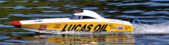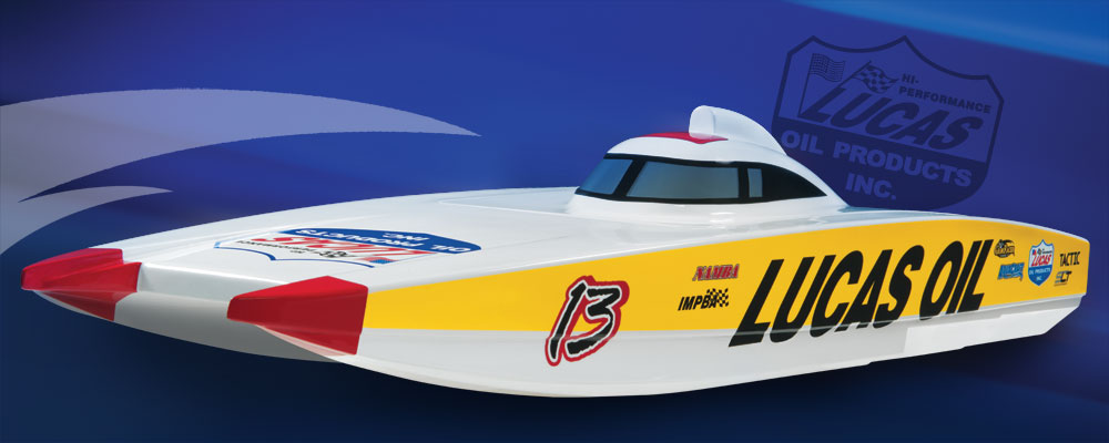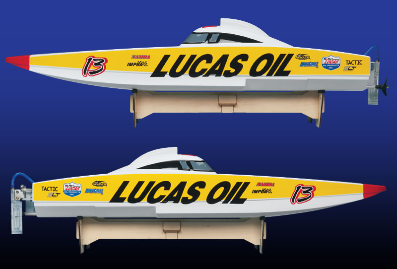 Autentisk Lucas Oil Off-shore racer dekor og oppstillingskrybbe.