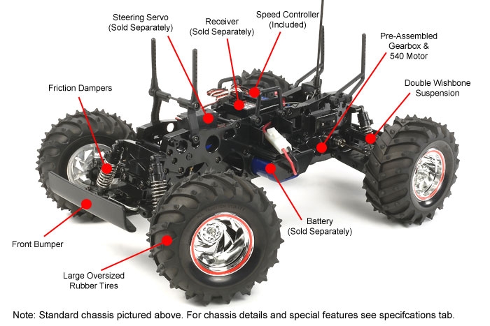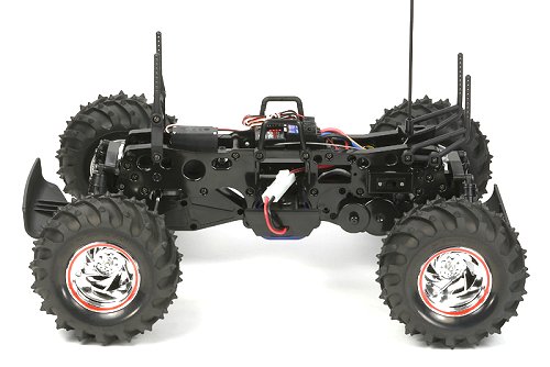 130 mm monsterhjul med blanke felger, ABS ramme, kulelagret, differensialer, gearboks og "dobble wishbone" støtdemperoppheng for myk off-road kjøring.