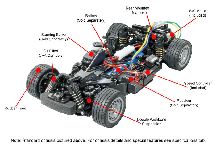 Originale skala hjul med krom felger, ABS ramme, differensialer, gearboks og uavhenging støtdemperoppheng.
