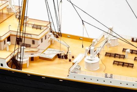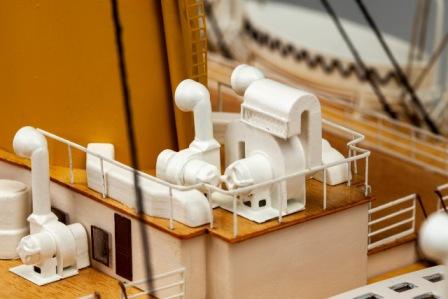 Master, alle kledningsbord til skrog og dekk, dekksbeslag, ankere, ankerkjetting, skorsteiner, koøyer, støpte livbåter + mye annet støpt i plast og messing.