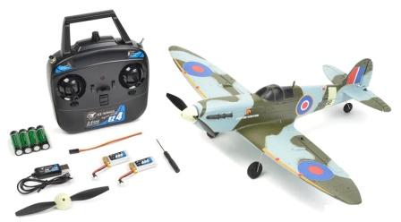 Leveres med 4-kanals 2,4GHz radio, 6-axis gyro, 3 stk servoer, 2 stk 3,7V 400mAh Li-Po-batterier, 4 stk 1,5V batterier til sender og USB-lader.