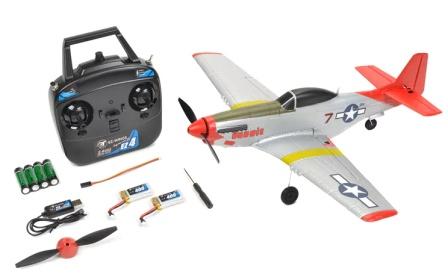 Leveres med 4-kanals 2,4GHz radio, 6-axis gyro, 3 stk servoer, 2 stk 3,7V 400mAh Li-Po-batterier, 4 stk 1,5V batterier til sender og USB-lader.
